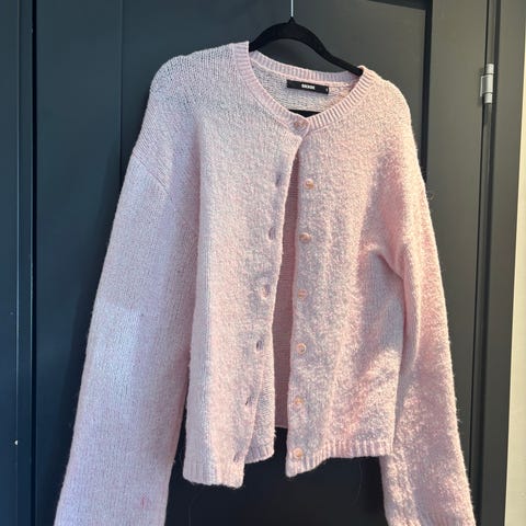 Zara cardigan for dame i størrelse L. Cardiganen er rosa og laget i polyester. Modellen har rund hals, lange ermer og knepping foran. Yttersiden er dekket av paljetter som gir et blankt uttrykk, mens innsiden er glatt for komfort.