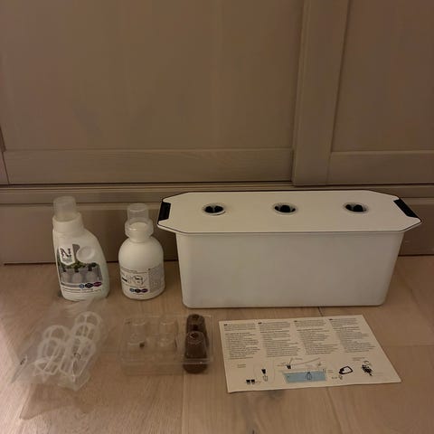 Hydroponisk dyrkekasse med moglegheit for seks pluggar samstundes. Heilt i orden, fin og pen - blir berre ikkje brukt lenger.