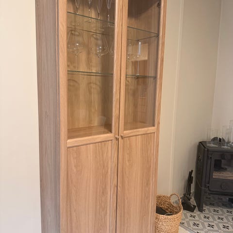 Eikmønstret BILLY bokhylle fra IKEA med oxberg vitrinesører dører.