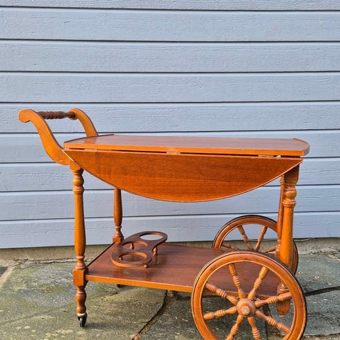 Serveringsbord tralle i tre med to hyller og hjul. Øvre hylle har kant rundt for å holde gjenstander på plass, og nedre hylle gir ekstra oppbevaringsplass. Trallen har store hjul foran og mindre hjul bak for enkel forflytning, samt håndtak på den ene siden. Under øverste hylle er det utsparinger til flasker eller glass. Passer som serveringsbord eller bartralle i stue, spisestue eller kjøkken.