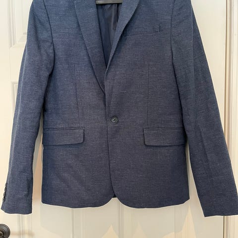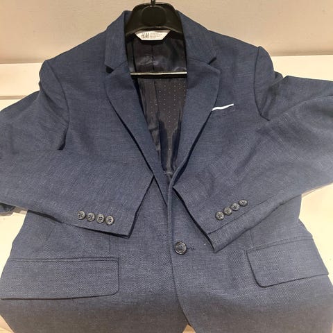 Meget pent brukt blå blazer fra HM i str 13-14 år. Fin til jeans m/skjorte eller t-shirt. Linblanding. Fin struktur i stoffet. Klikk på bildene for å få bedre oppløsning på bildevisning. Jakken kan vaskes på 40 grader i maskin.