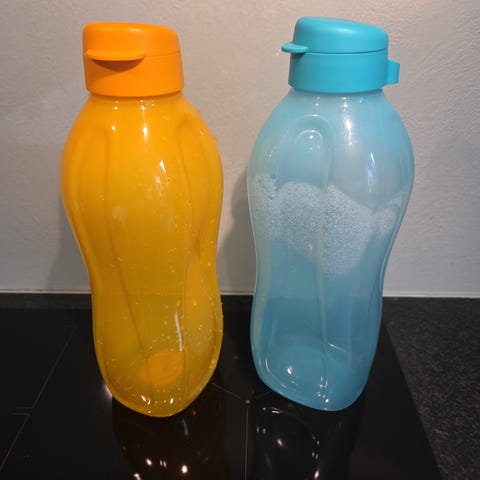 Tupperware drikkeflasker i plast. Flaskene har skrulokk med drikkeåpning og ergonomisk fasong for godt grep. Flere farger, blant annet rød, blå og gul. Egner seg til vann og andre kalde drikker hjemme, på skole, jobb eller tur.