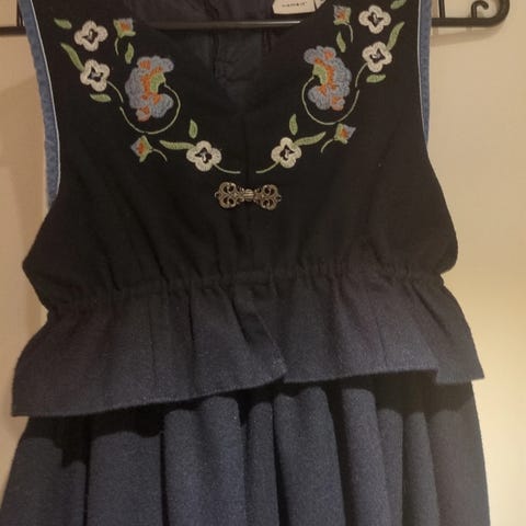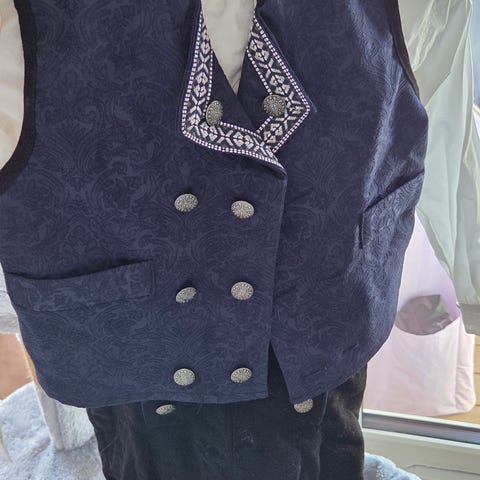 Name it festdrakt for gutt i størrelse 134. Vesten er grå med mønster og har svarte detaljer langs kantene. Bukse er svart. Den er laget i bomull med glatt fôr på innsiden. Plagget passer til penbruk med en skjorte f.eks ved høytider, selskap eller andre anledninger der man ønsker et mer formelt antrekk.