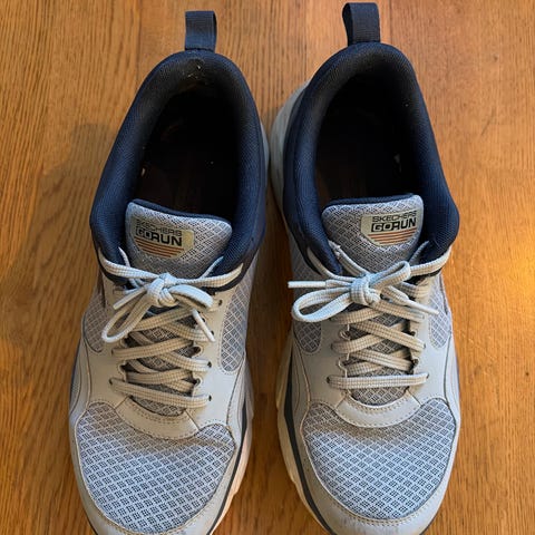 Skechers joggesko med Dry Foam-innersåle i størrelse 43. Skoene er beige med overdel i syntetisk materiale og mesh som gir god lufting. Yttersåle i EVA-materiale med mønster for grep. Modellen har snøring foran og hempe bak for enklere av- og påtaking. Egnet som fritids- og hverdagssko. Selges kr.200