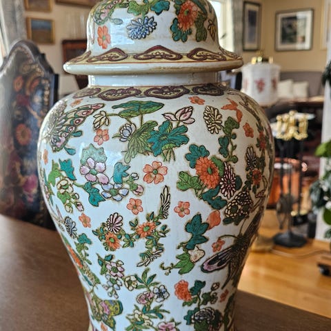 Blå-hvit porselenskrukke med kinesisk motiv og trestativ