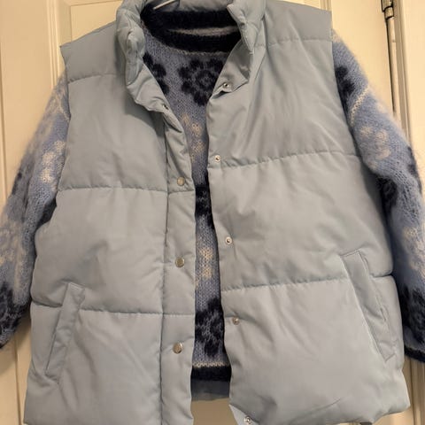 Kjøpt for liten, brukt en til to ganger, som ny. Str xl, men passer også l. Den har glidelås i front, to sidelommer med glidelås. Glidelåsene er i kontrastfarge olivengrønn. Innvendig også olivengrønn som sees tydelig i hetta. Den kan ikke taes av. Se strikk nederst på vesten og i armhuler. Litt stretsh.