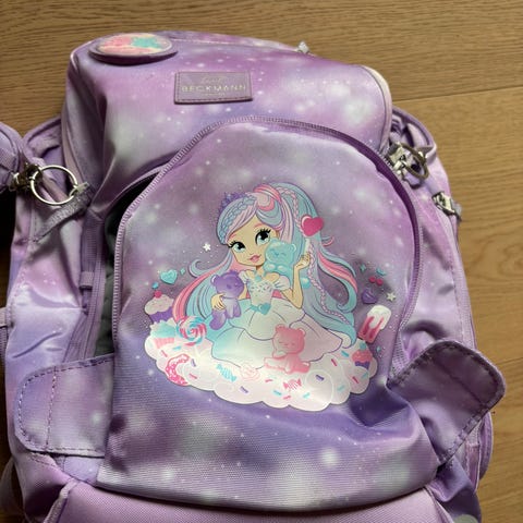 Smiggle ryggsekk i stoff for unisex. Sekken er lilla med trykk av figurer, regnbuer og andre motiver. På forsiden er det en stor, myk kattedesign som er festet som en del av sekken. Ryggsekken har justerbare skulderstropper med polstring og mønster, samt sidelommer i netting som kan brukes til småting. Egnet som barnehage- eller småbarnssekk til hverdagsbruk, utflukter eller som ekstra sekk til leker og utstyr.