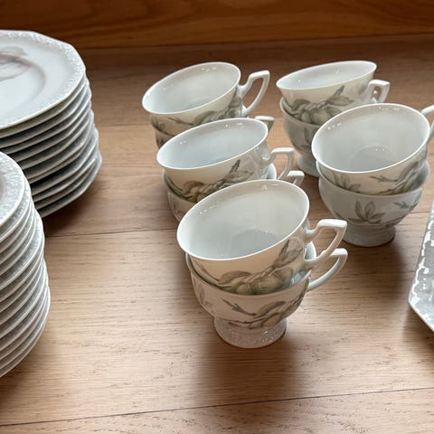 Reichenbach VEB porselensservise med blomsterdekor. Serviset består av kopper med tilhørende skåler og asjetter/fat i hvitt porselen med flerfarget blomsterdekor og gulldekor langs kantene. Delene har bølgete, profilert kant som gir et klassisk uttrykk. Egnet som kaffeservise eller til servering av dessert og kaker. Rosenthal-stempel under hver del.