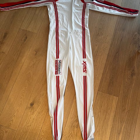 Heltrukket skidress i hel lengde med lange ermer. Drakten har hovedfarge rød med mørke kontrastfelt langs sider, skuldre og legger. Glidelås foran og tettsittende passform som egner seg til langrenn, skøyter eller annen vintertrening der man ønsker en aerodynamisk og kroppsnær dress. Stoffet ser ut til å være et elastisk syntetisk materiale som gir bevegelsesfrihet under aktivitet. Selges som to ulike fargevarianter, rød/svart og svart/grå, begge med samme type passform og bruk.