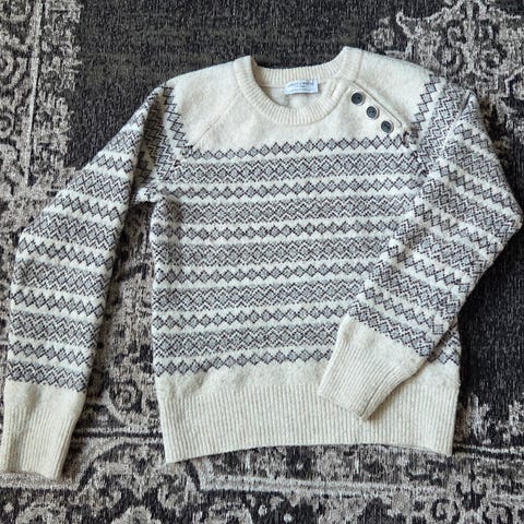 Selger en kjempefin og tidløs strikkegenser fra Jean Paul i fargen offwhite med svart lusemønster.