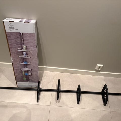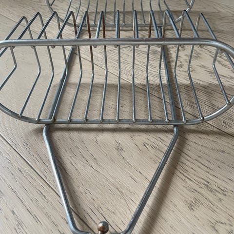 Dusjhylle med kroker. To etasjer og henger stabilt på plandebatteri pga dobble kroker. Det er ca. 15 cm mellom senter på hver krok (se bilde).