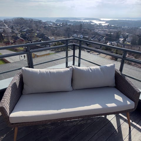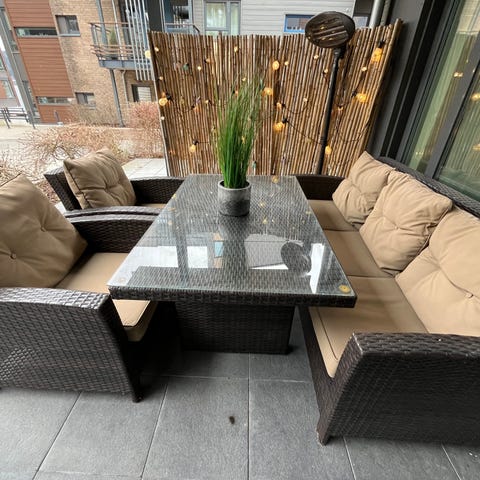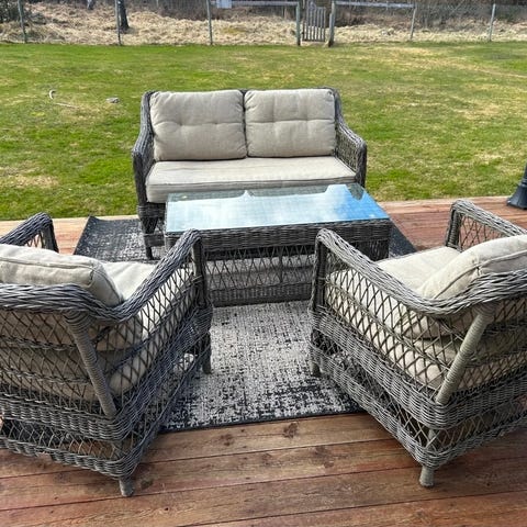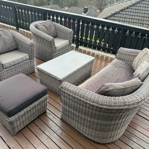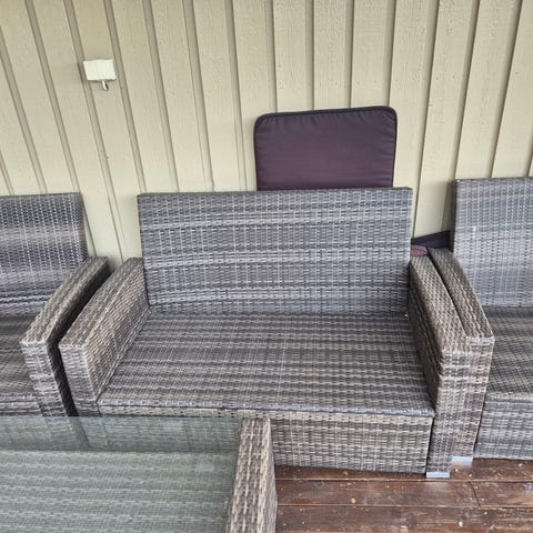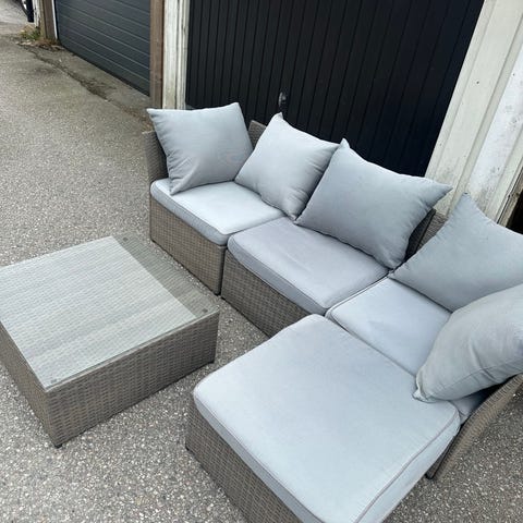 Hagesalong i rotting bestående av 2-seter sofa, to stoler og rektangulært bord. Møblene er laget i kunstrotting i gråtoner, med grå puter på sete og rygg. Bordet har bordplate i glass. Passer til bruk på balkong, terrasse eller i hagestue. Den ene stolen er noe slitt på det ene armlenet, som vist på det ene bildet. Bordet er 50x100cm og 44 cm høyt.