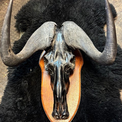 Replika Zuluskjold med assegai og stridsklubbe. Lagd av kuskinn.