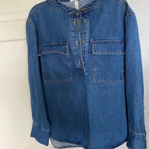 Jeansskjorte i str M i 100 % bomull fra Moss Copenhagen. Brukt kun et par ganger, så den fremstår som ny. Nyvasket, kan sendes.