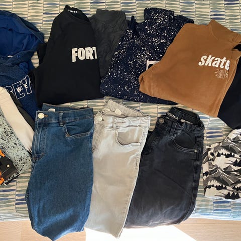 Brukt samtidig, noen lapper er klippet av men alt tilsvarer størrelse 158/164 vil jeg si.