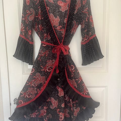 byTiMo hverdagskjole i cordfløyel for dame i størrelse S. Kjolen er flerfarget med små blomster og har dekorative blondebånd i kontrastfarge. Modellen har lange ermer, høy hals med blondekant og glidelås bak. Stoffet er strukturert cordfløyel som gir kjolen et mykt og teksturert uttrykk. Passer som hverdagskjole eller til enkle anledninger.