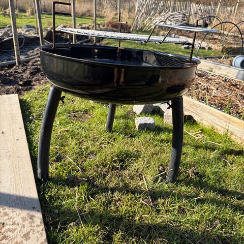 Espegard bålpanne med stativ i svart stål. Bålpannen har rund ildskål og avtagbart grillrist i metall. Egnet til grilling og bålbruk utendørs i hage, på terrasse eller hyttetomt. Ikke brukt mange ganger, mest stått til pynt :-)