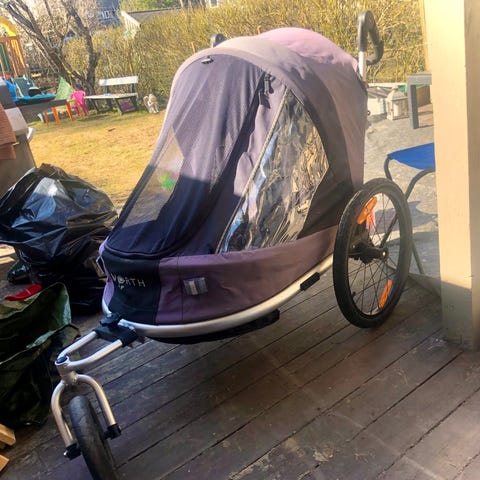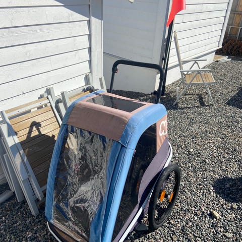Praktisk og solid sykkelvogn for to barn selges. Perfekt for aktive familier som ønsker å kombinere sykkelturer, trilleturer og friluftsliv.