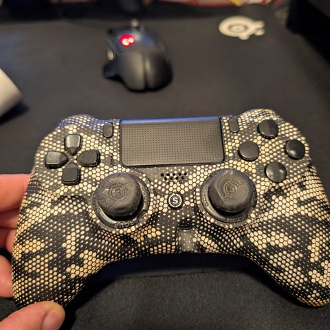 Nacon Revolution Pro Controller til PlayStation 4 i Call of Duty Special Edition-design. Kontrolleren har grønn front med trykk og dekor, samt sort bakside med strukturert grep. Den er utstyrt med styrekors, analoge spaker, skulderknapper og triggere, samt touchpad og PlayStation-knapp. På baksiden finnes ekstra knapper og brytere for justering av funksjoner. Egnet for bruk med PS4-konsoll til ulike typer spill. Mangler en joystick