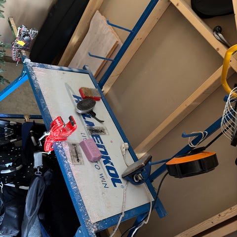 Swix smørebord for ski i sammenleggbart stativ med rød metallramme. Bordet har rektangulær plate med Swix-logo på oversiden og tverrstag for økt stabilitet. Egnet som arbeidsbord ved prepping og smøring av ski i garasje, bod eller verksted. Bordet kan brukes sammen med egne skistøtter eller profiler etter behov.