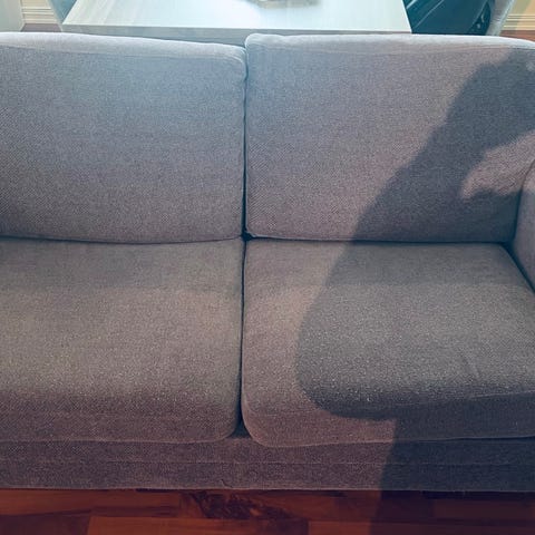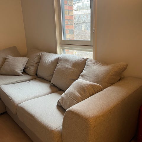 Selger sofa med praktisk oppbevaring grunnet flytting, pent brukt men noen synlige flekker her og der som sikkert går bort med en vask. Hentes på Raufoss etter avtale.