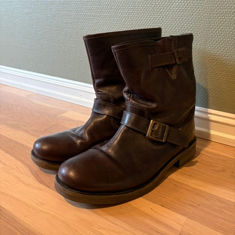 støvler i størrelse 43. Modellen er en ankelhøy snørestøvel i brun semsket skinn. Skoene har lisser foran og en kraftigere yttersåle. Passer til bruk i hverdagen eller til mer pene anledninger der man ønsker en enkel og nøytral skinnstøvel.