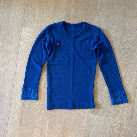 Janus merinoull t-skjorte for barn i størrelse 110. T-skjorten er i rosa med kontrastfarget erme og Minnie Mus-print. Har hatt et hull på brystet som er lappet.