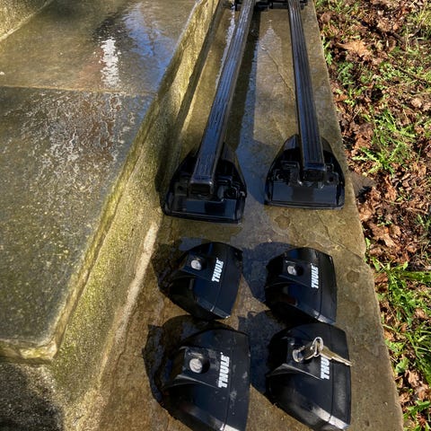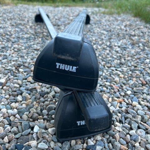 Thule takstativ i svart med føtter og tverrstenger. Stativet leveres med flere lastestropper festet på stengene, egnet for sikring av last på biltaket. Passer til bilmodeller som er kompatible med denne typen Thule-føtter og tverrstenger. Egnet for transport av for eksempel bagasje, ski eller annet utstyr som kan festes på takstativet med stropper eller egne holdere.