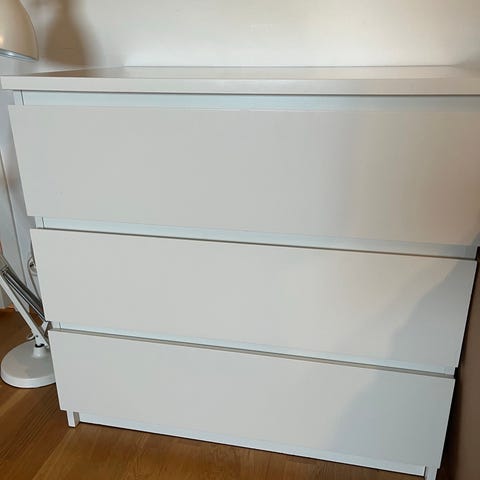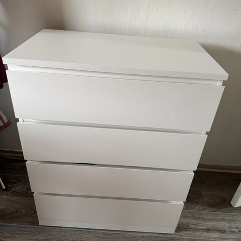 Hvit IKEA kommode med 4 skuffer og glassplate på toppen. Pent brukt, enkelte bruksmerker kan forekomme, men kommoden er i god stand. Hentes på Dvergsnes.