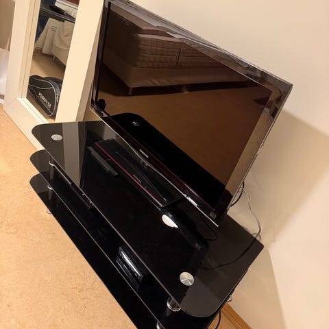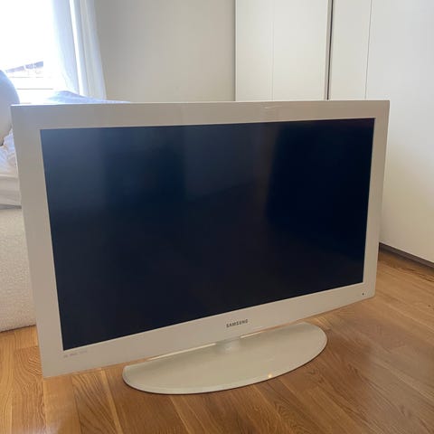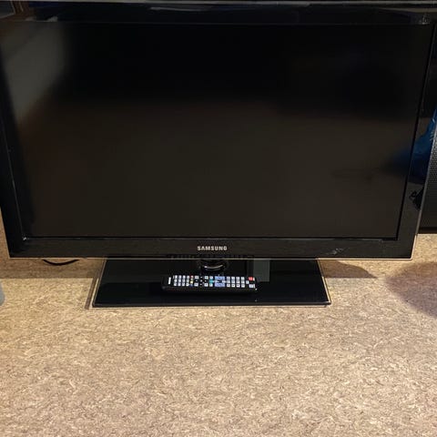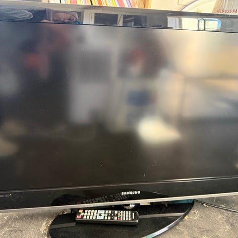 Tatung TV med bordstativ og fjernkontroll. Skjermen har flat front og relativt bred ramme. Fysiske knapper for betjening er plassert på siden av TV-en. Egner seg til vanlig TV-bruk eller som ekstern skjerm der det er behov for en enkel skjermløsning.