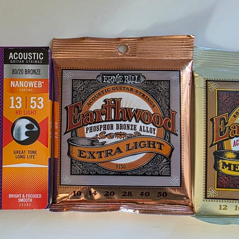 Selger to uåpnede pakker med strenger til akustisk gitar.
