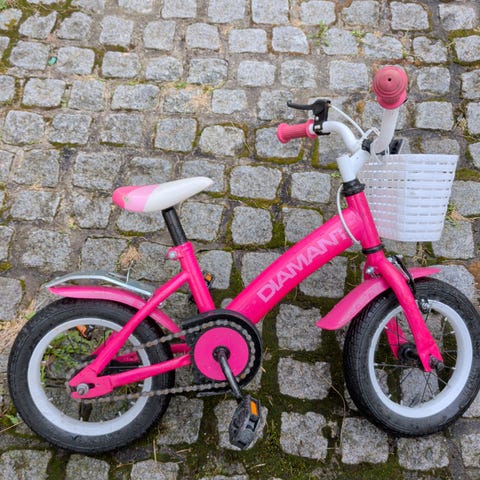 Pen sykkel, 12" hjul, følger med støttehjul ledestang og kurv.