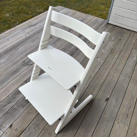 Stokke Tripp Trapp høy barnestol i grå farge. Klassisk trappeformet stol i tre med justerbart sete og fotbrett som kan tilpasses barnets høyde. Stolen er konstruert for å gi stabil sitteposisjon ved bordet. Egnet som spise- og aktivitetsstol for barn over lengre tidsbruk etter hvert som barnet vokser. Noe slitasje i lakk kan forekomme, se bilder for detaljert inntrykk av tilstand.