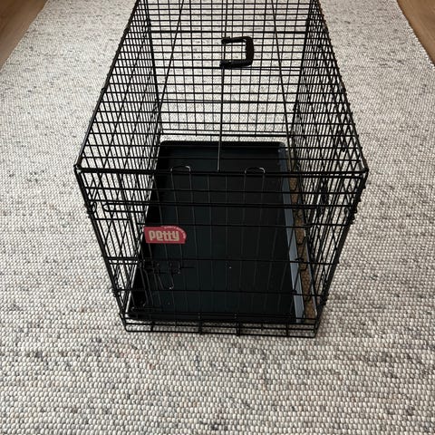 Hundebur i aluminium med svarte plater og sølvfargede sprosser. Buret har én dør foran med lås og skrå bakside som gjør det egnet for plassering i bilbagasje. Åpne sprosser gir god lufting på sider og foran, mens tette plater nederst og bak gir skjerming. Egner seg for liten/mellomstore hunder, både til bruk i bil og som fast liggeplass inne.