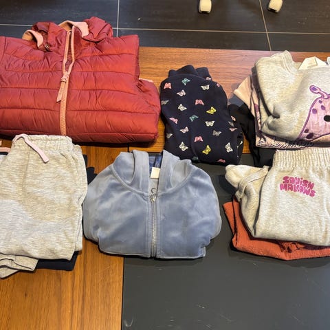 Selger en fin klespakke i beige, hvite farger, til hente med jakker, fleecegenser, bukser, gensere. T-skjorter etc.