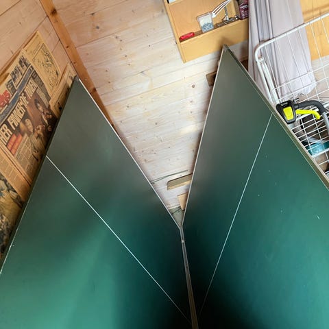 Stiga bordtennisbord i klassisk grønn farge. Bordet har sammenleggbare ben i metall og spilleflate i plate-materiale. Det følger med nett og nettstolper som festes med klemmer på bordkanten. Egner seg til bordtennisspill innendørs i for eksempel garasje, kjeller eller hobbyrom. Overflaten viser tydelig bruksslitasje, men bordet er funksjonelt til fritidsspill. Kan pusses og males.