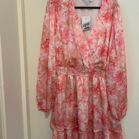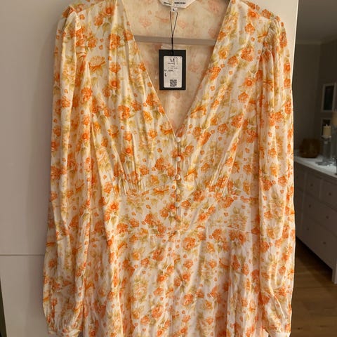 Lekker kjole i gul med blomster , med knytting i livet og litt lenger bak