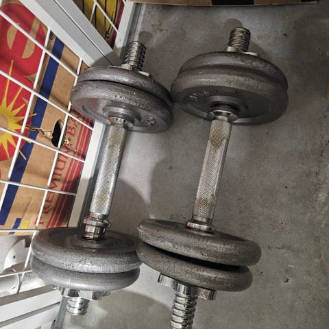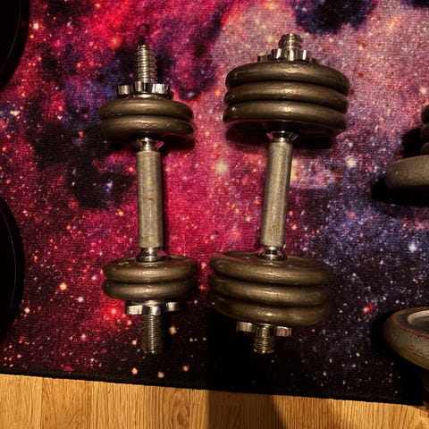 Settet består av to manualer med metallstang og røde vektplater. Hver manual veier omtrent 5 kg, og vektene kan tas av og på for å justere belastningen. Stengene har rillet grep for bedre håndtering, og vektskivene festes med låser på hver side.