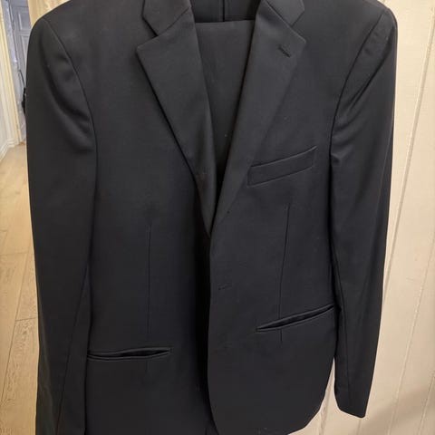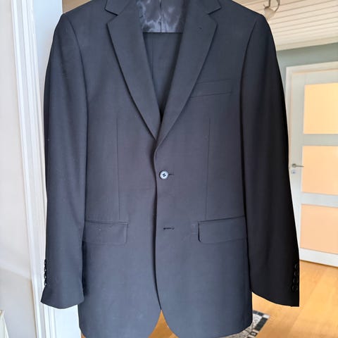 Jakken har størrelse 44, buksen 31/32 og skjorten er 37/38S. Alt er slim fit.