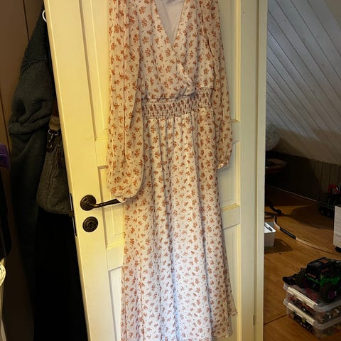 Careless Belle sommerkjole i størrelse L. Kjolen er laget i lett chiffon og har rosa blomstermønster på lys bunn. Modellen har lange ermer, markert midje med strikk og ankellang lengde. Passer som sommerkjole til dame.