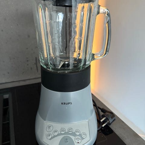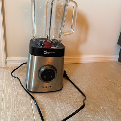 Pent brukt Philips blender med glasskanne og medfølgende filterinnsats. Vært veldig fornøyd med denne, men bruker den ikke lenger. Passer best til å lage enkel smoothie eller lignende. Er ikke like god til å knuse mye frossent på en gang. Noen få merker av bruk. En liten del av det ene knivbladet er brukket av, men fungerer ellers som den skal. Kan ta maks 1,5 liter. 750 W. Veier total ca 4,2 kg.