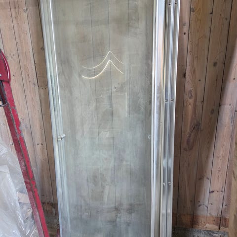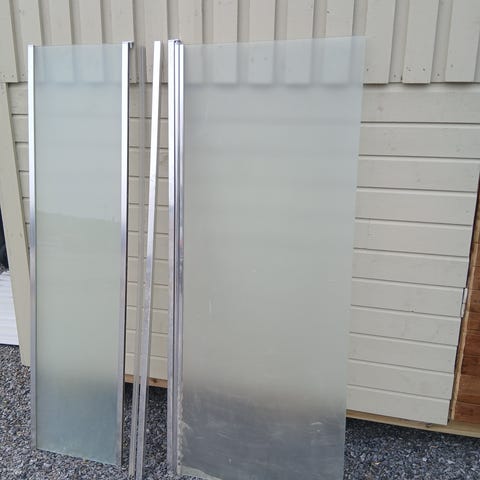 Dusjvegg med avrundet hjørne. Karm til å feste dusjveggen i vegg følger med. Brukte skruer følger også med.