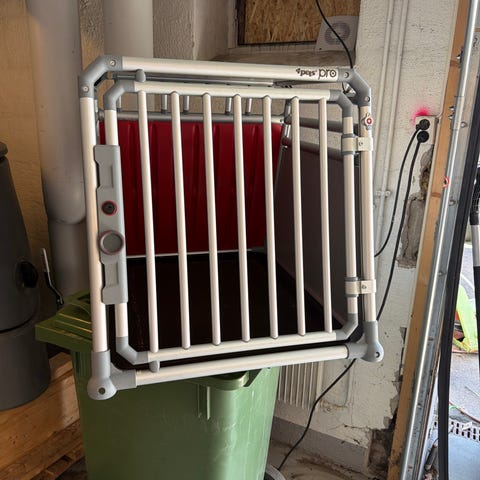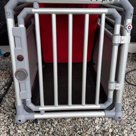 4pets Pro hundebur i størrelse M i aluminium med tette sideplater og rød bakvegg. Gitterdør i front. 4pets bur har god kvalitet og er kollisjonstestet. Buret kan låses. Det følger med ekstra ben for bruk i nedsenkende bagasjerom og stropper til å sikre buret. Skrå bakside tilpasset bilbagasjerom.