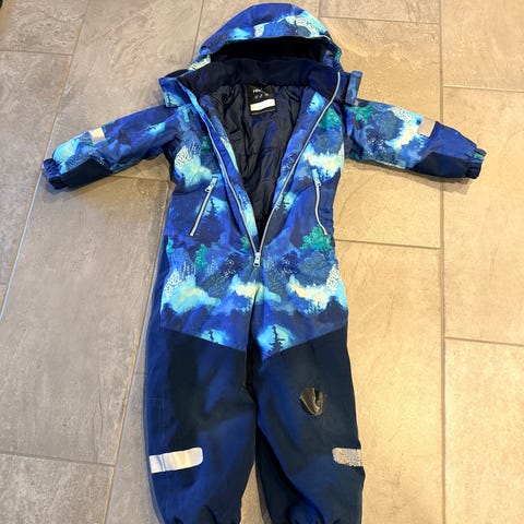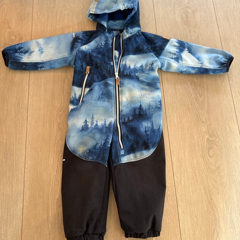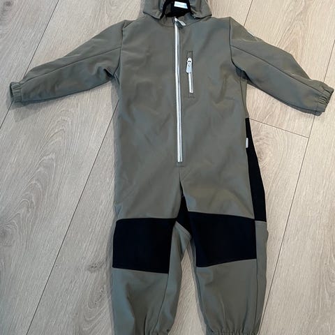 Myk softshell-dress til småbarn i vind- vanntett softshellmateriale. Slitesterk underdel og fotstropper. Avtagbar hette.