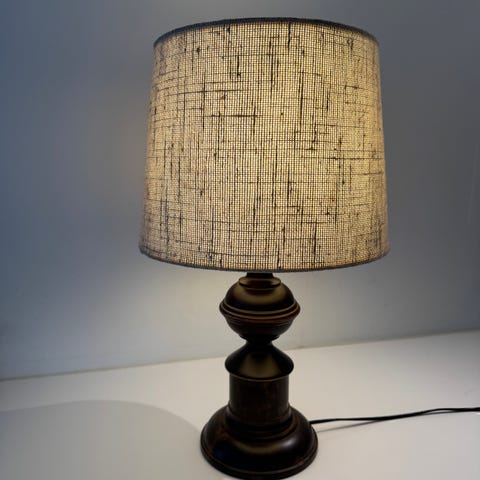 Bordlampe i keramikk i bruntoner med dekorative felter på lampesokkelen. Lampen har en lys tekstilskjerm som gir et mykt og behagelig lys. Passer på sidebord, nattbord eller skrivebord i stue, gang eller soverom. Strømkabel med bryter er festet i lampesokkelen. Skjermen er avtagbar, og lyspære kan byttes etter behov (standard sokkel, nærmere spesifikasjon ikke oppgitt).høyde 50 cm med skjerm