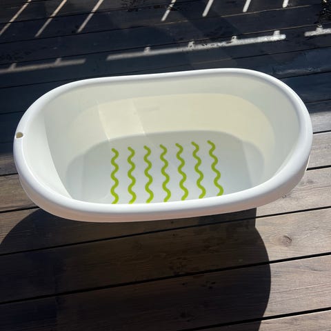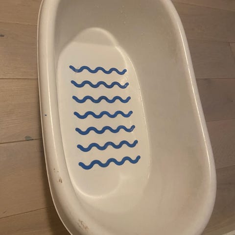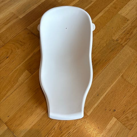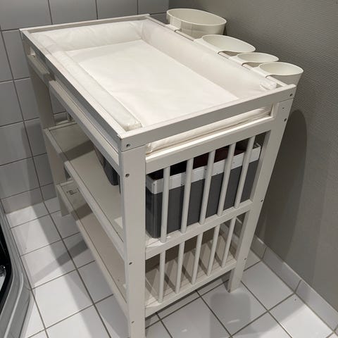 Trillebord i tre med integrert badekar i hvit plast. Øverst er det et babybadekar formet for å støtte barnet under bading, kan tas ut enkelt. Under badekaret er det to hyller som gir plass til oppbevaring av bleier, håndklær og annet stelleutstyr. Bordet står på hjul, noe som gjør det mulig å flytte det mellom rom ved behov. Slange til uttømming følger med.