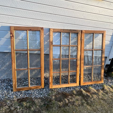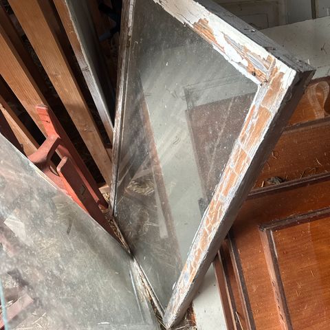Trevinduer med sprosser. Vindusrammene ser ut til å være i ubehandlet eller værslitt treverk og har fire ruter i hver ramme. Egner seg til bruk i uthus, anneks, hytte eller til gjenbruk og oppussing i andre DIY byggeprosjekter. Antall, nøyaktige mål og type glass er ikke oppgitt og bør kontrolleres ved interesse.