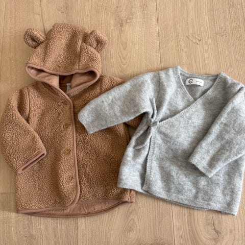 H&M genser med hette for baby, unisex, i størrelse 68. Genser er strikket i akryl og har flerfarget mønster med ulike figurer og border. Passer til hverdagsbruk og som et ekstra lag over body for barn i størrelse 68. (4-6 månader)