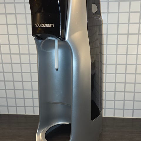 Sodastream kullsyremaskin i sølvfarge. Fungerer akkurat slik den skal. Maskinen brukes til å lage kullsyreholdig vann hjemme ved hjelp av gasspatroner som monteres på baksiden. Det følger med tre Sodastream CO₂-patroner: en uåpnet, en nesten full og én som er tom og derfor kan byttes inn. Maskinen har frontåpning for flaske og utløserknapp på toppen. Kommer med en flaske.