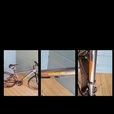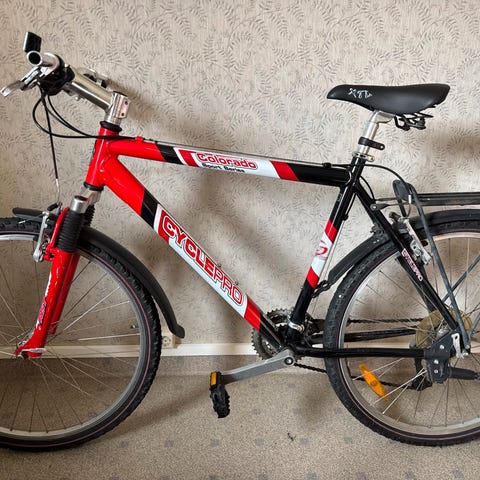 Merida terrengsykkel med piggdekk for unisex med 46 cm ramme og 26" hjul. Sykkelen har rød og hvit ramme, rette styre og dempegaffel foran. Utstyrt med felgbremser og GripShift-gir på styret. Passer til bruk på grusveier og enklere terreng. Støtte og skjermer foran og bak er montert på sykkelen. Sykkelen må overhales. Må også hentes.